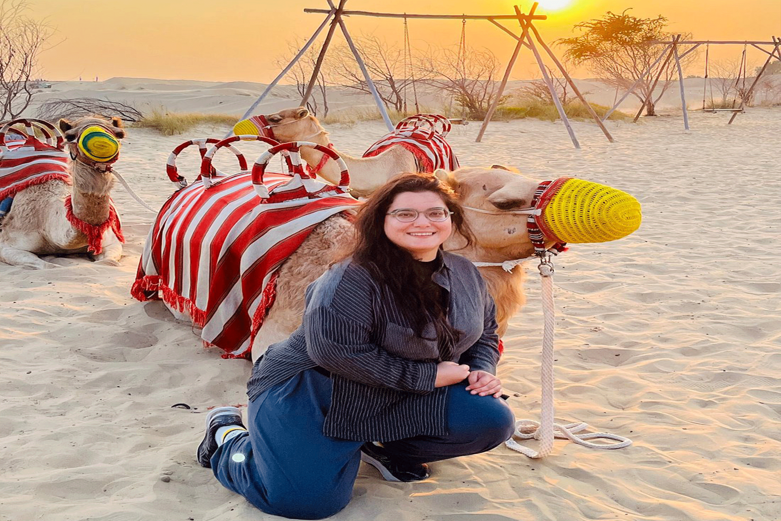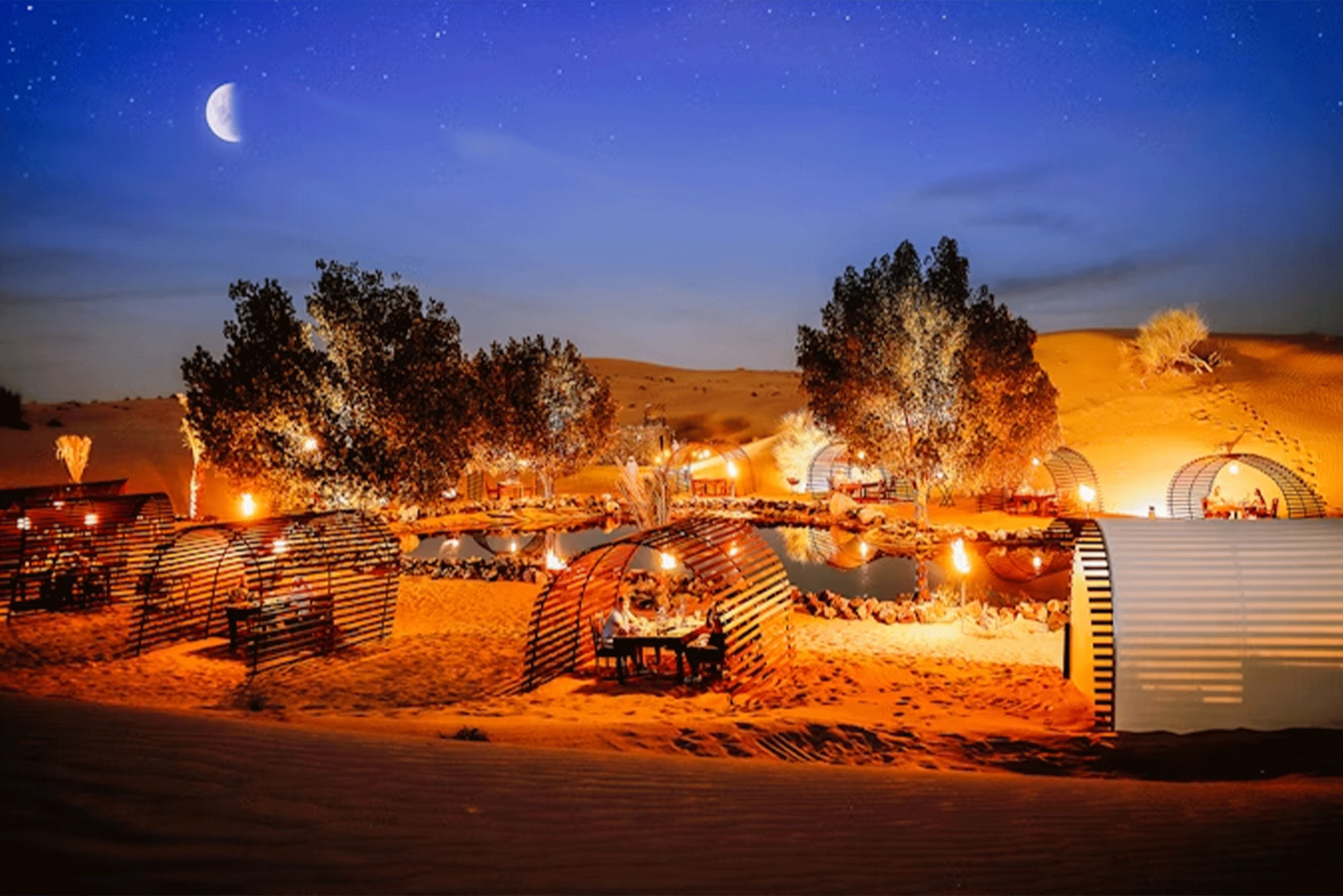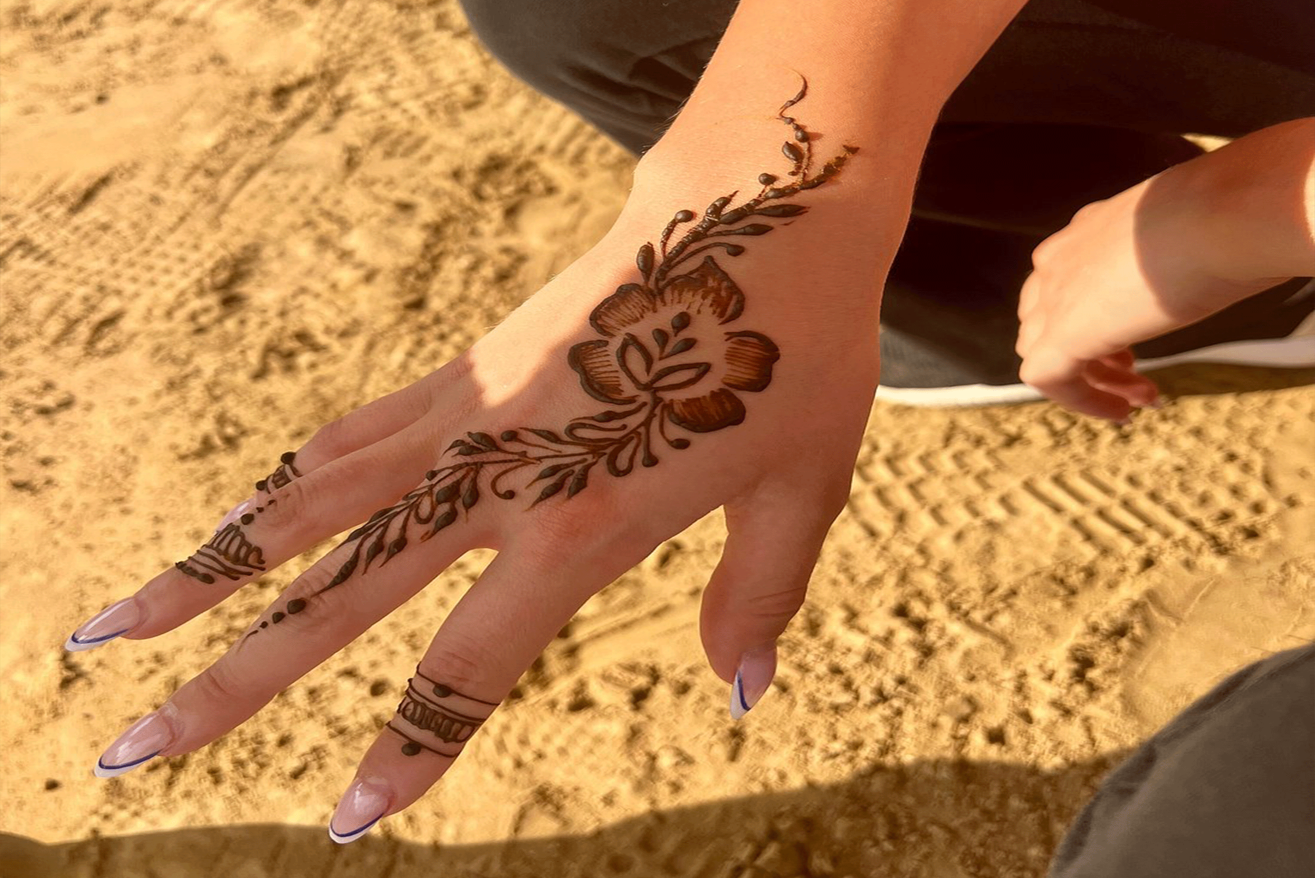 Our Desert Safari includes dune bashing, camel riding, sandboarding, quad biking (optional), henna painting, falcon photography, live entertainment, and a BBQ dinner at a Bedouin-style camp.